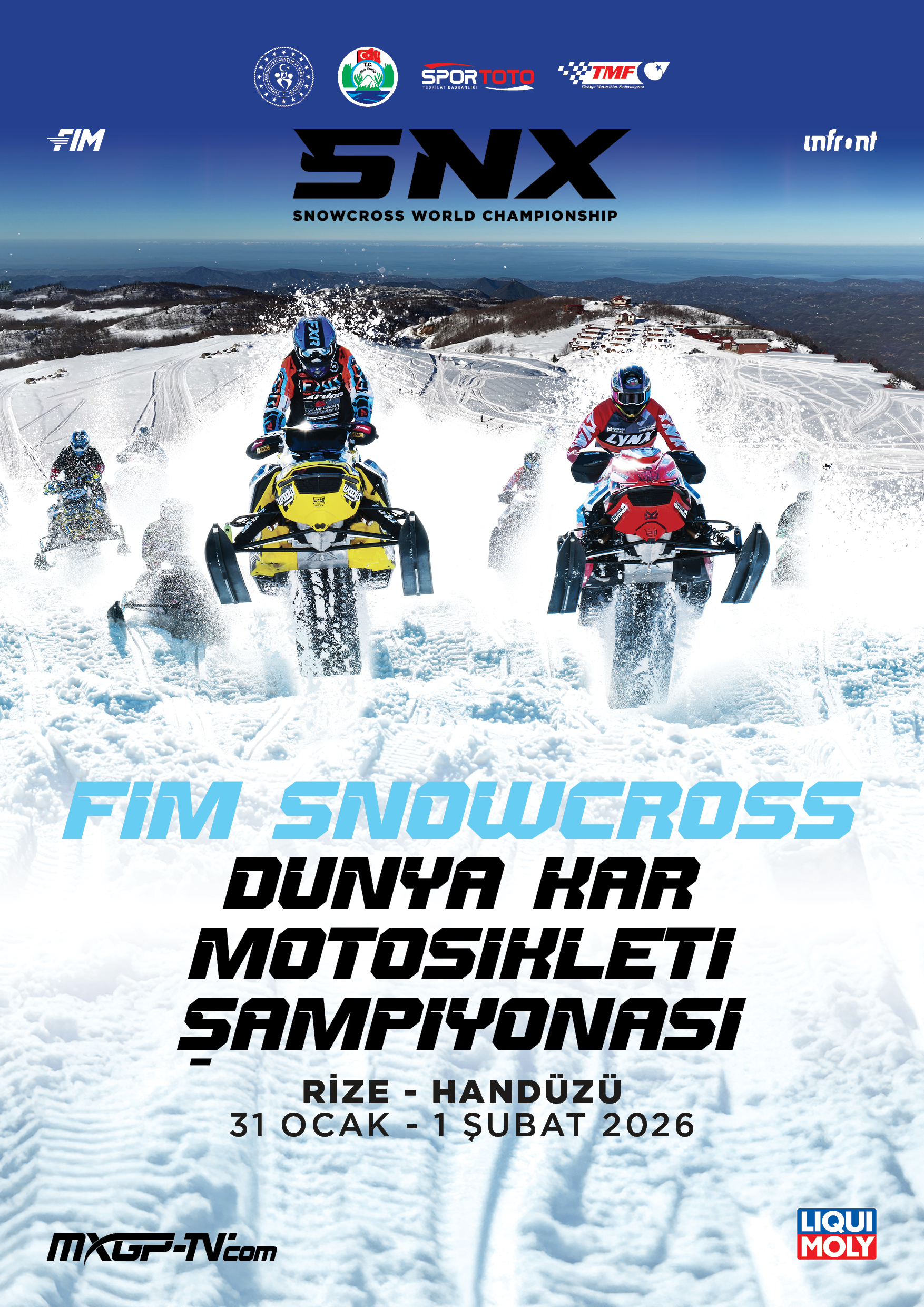 SNX Türkiye Dünya Kar Motosikleti Şampiyonası, Türkiye’nin tanıtımı ve spor turizmi vizyonu kapsamında ev sahipliği yaptığı en önemli uluslararası spor organizasyonları arasında yer alıyor. Uluslararası Motosiklet Federasyonu (FIM) tarafından dünyanın en prestijli ekstrem kış spor organizasyonlarından biri olarak gösterilen Dünya Kar Motosikleti Şampiyonası, Gençlik ve Spor Bakanlığı, Rize Valiliği ve Türkiye Motosiklet Federasyonu’nun destekleriyle 2026 yılında bir kez daha Türkiye’de gerçekleştirilecektir. 2026 yılının ilk dünya şampiyonası olma özelliğini taşıyan organizasyon, bu yıl ilk kez Karadeniz’in yüksek rakımlı doğa kuşağında, Rize’de düzenlenecek.